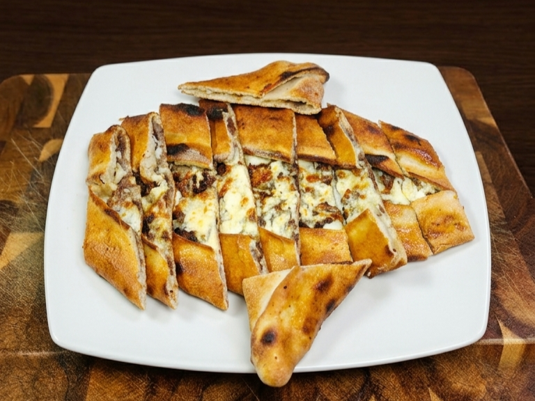 10,00 € Pide mit Hackfleisch & Weichkäse (A,G)